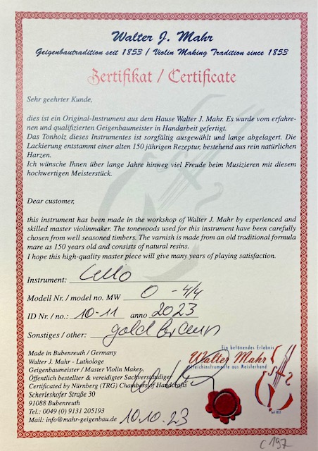 Das Cello kommt mit einem Zertifikat von Walter Mahr.
