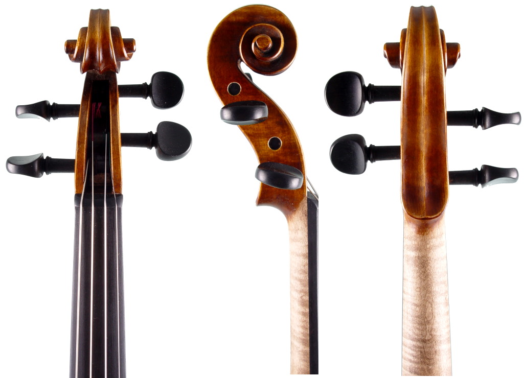 Der goldbraune Lack nach einem alten Familienrezept ist handaufgetragen. "Soft altdeutsch" imitiert: zeitloses Design. Die Geige sieht weder alt noch neu aus. Da die Holzoberflächen sämtlich nur mit Ziehklingen bearbeitet sind (nicht mit Sandpapier) entsteht ein porentiefer Blick auf die Schönheit des Holzes.