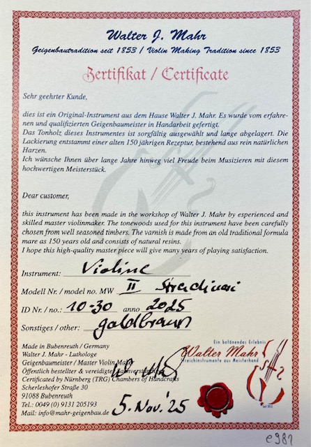 Geige Walter Mahr, Bubenreuth 2025, 4/4 Größe, Stradivari-Modell, sehr schöne Arbeit, Qualitätsstufe II