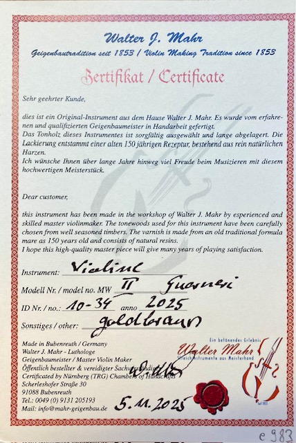 Geige Walter Mahr, Bubenreuth 2025, 4/4 Größe, Guarneri-Modell, sehr schöne Arbeit, Qualitätsstufe II