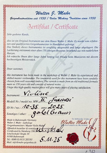 Geige Walter Mahr, Bubenreuth 2025, 4/4 Größe, Guarneri-Modell, sehr schöne Arbeit, Qualitätsstufe II