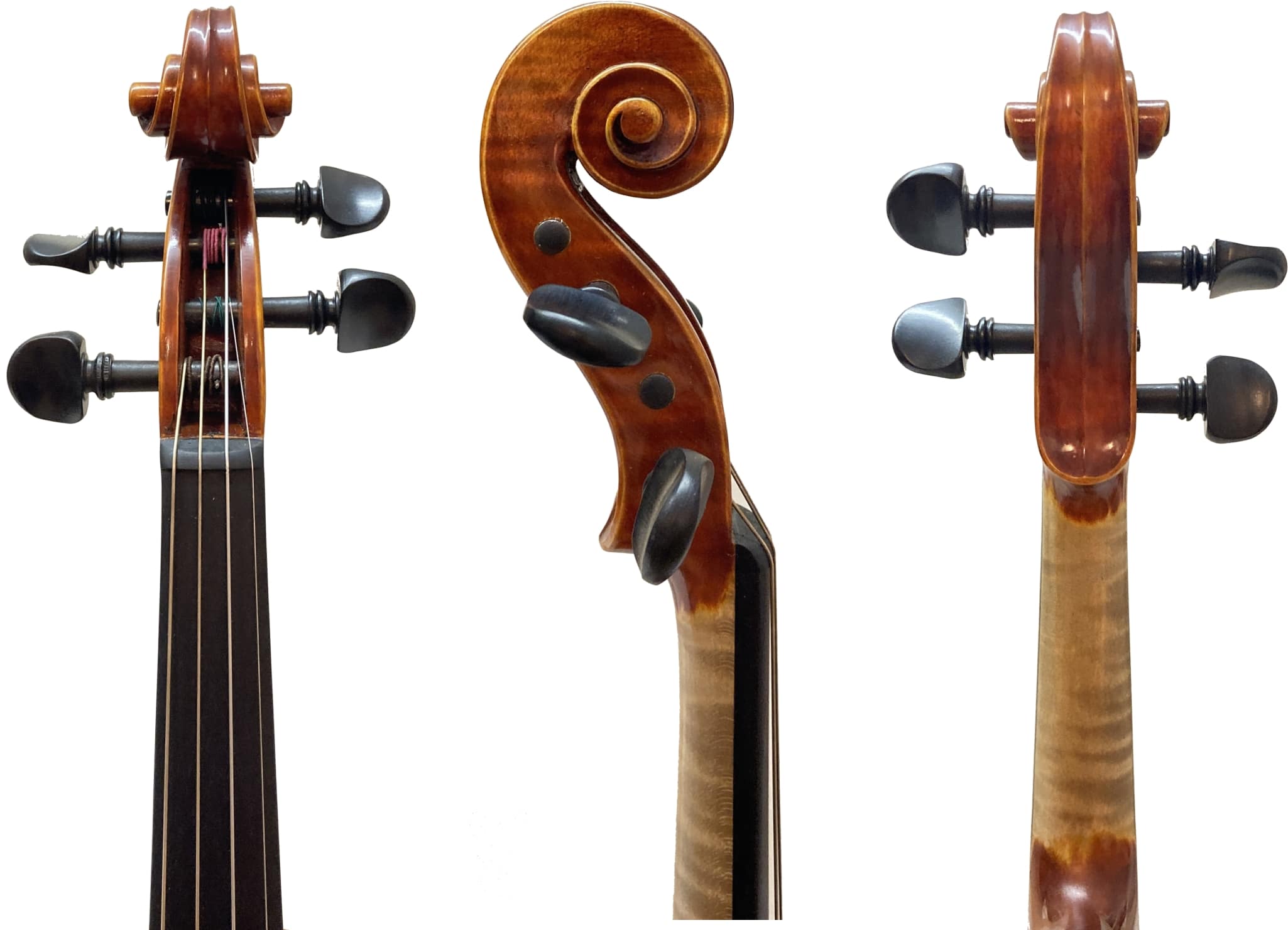 - Ebenholz-Garnitur: Wertvolles, tiefschwarzes Ebenholz bei Griffbrett, Kinnhalter (Guarneri-Modell), Saitenhalter und Wirbeln (jeweils veredelt mit schwarzem Reifchen).
